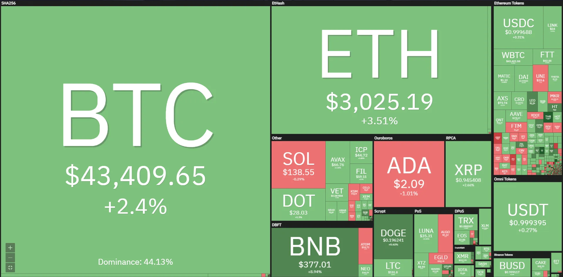 Bitcoin sau khi di chuyển lại gần ở vùng hỗ trợ quan trọng ngày đã cố gắng tăng ngược trở lại trên $43,000 và tín hiệu này giúp cho thị trường có phần trở nên lạc quan hơn khi sắc xanh đầu ngày đang dần bao trùm trở lại.
