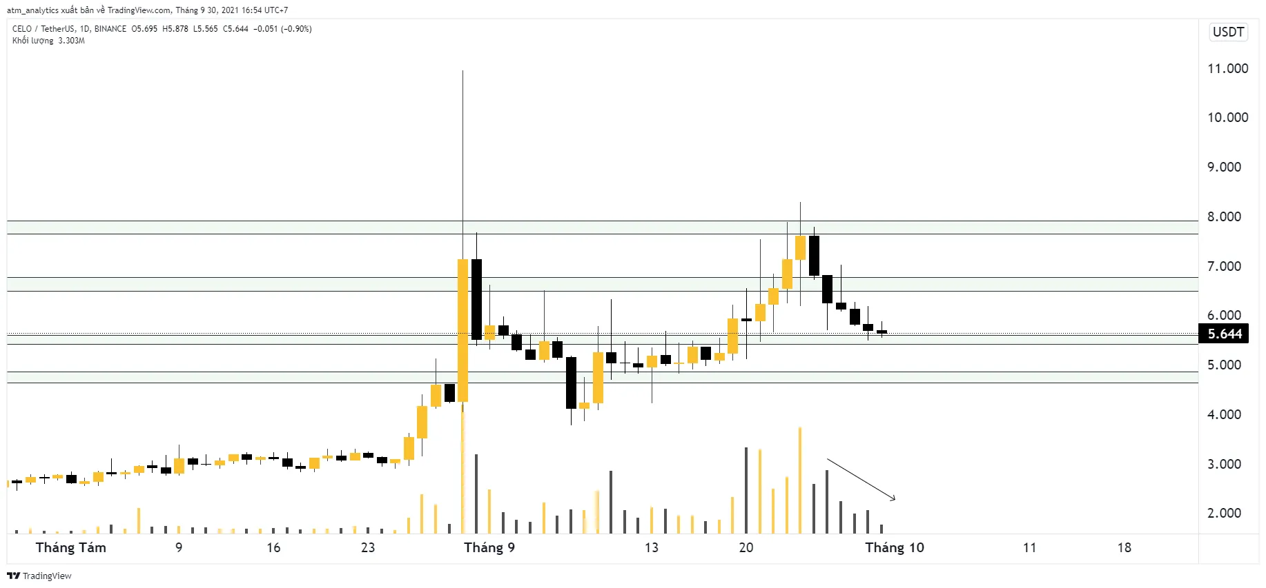 Trong khung 4H, có thể thấy khối lượng CELO được giao dịch trong những giờ qua là khá thấp và có dấu hiệu chuyển sang tích luỹ trên hỗ trợ $5.5 - $5.3. Tuy nhiên, ở giai đoạn này phe mua chưa xuất hiện rõ và khả năng sẽ phải tiếp tục tích luỹ. Do đó chúng ta cần tiếp tục quan sát kỹ hơn ở khu vực này.