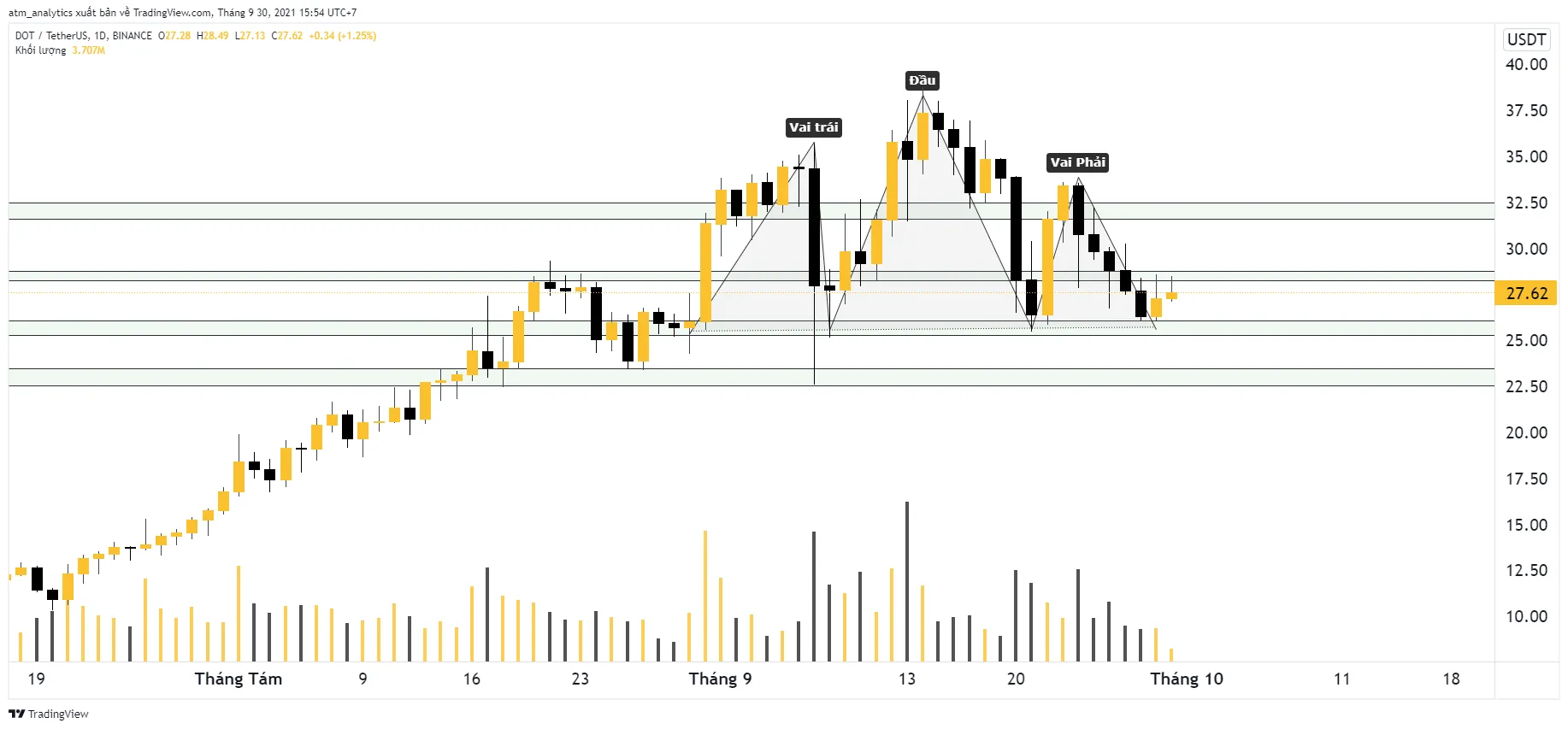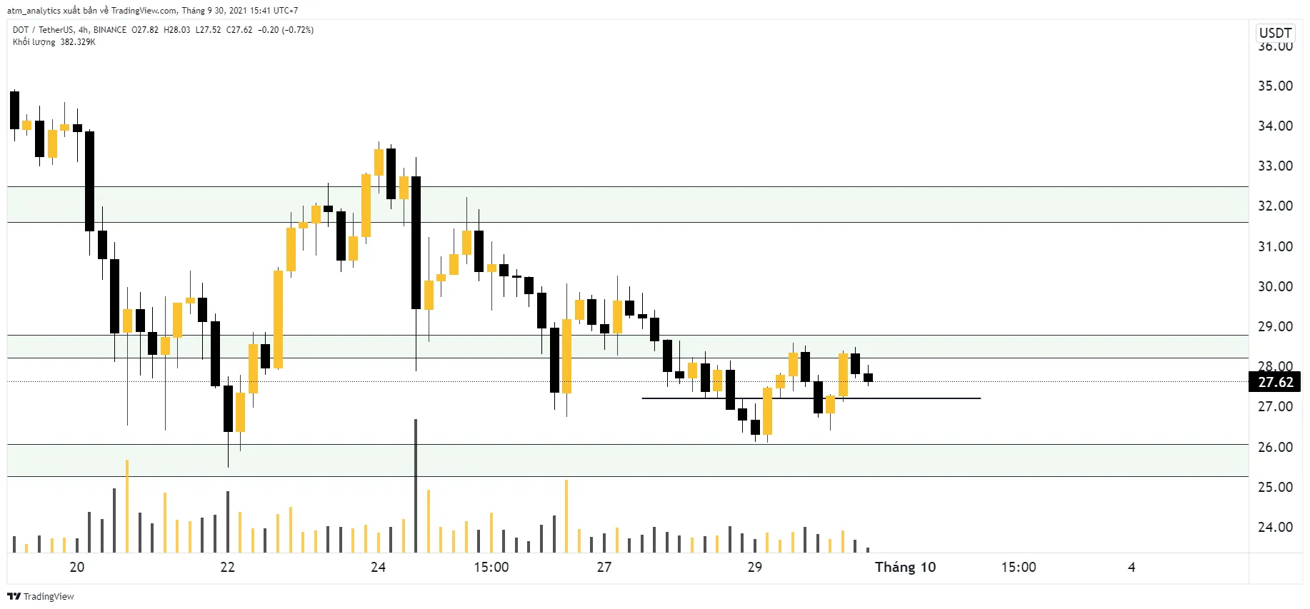 Quan sát cụ thể hơn trong khung 4H, nếu phe mua hấp thụ được lượng cung, giữ giá DOT được trên mức $27 thì khả năng cao DOT sẽ cơ hội phá vỡ kháng cự. Tuy nhiên, nếu phe bán tiếp tục áp đảo với khối lượng giao dịch lớn thì DOT có nguy cơ phá vỡ Neckline $26 - $25 của mô hình vai đầu vai trong khung ngày và giảm mạnh thậm chí có thể phá qua vùng hỗ trợ tiếp theo $23 - $22.